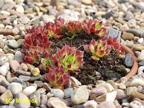 Kleine bis mittelgroße grüne Rosetten mit leuchtend roten Spitzen, Blüte: rosa