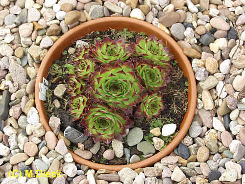 Mittelgroße bläulich grüne Rosetten,. Blätter mit auffallend tiefroten Spitzen, im Winter dunkelrot färbend. sehr hübsch! Blüte: rosa