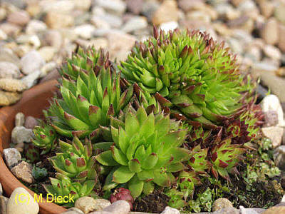 Kleine bis mittelgroße grüne Rosetten mit roten Spitzen, Blüte: rosa